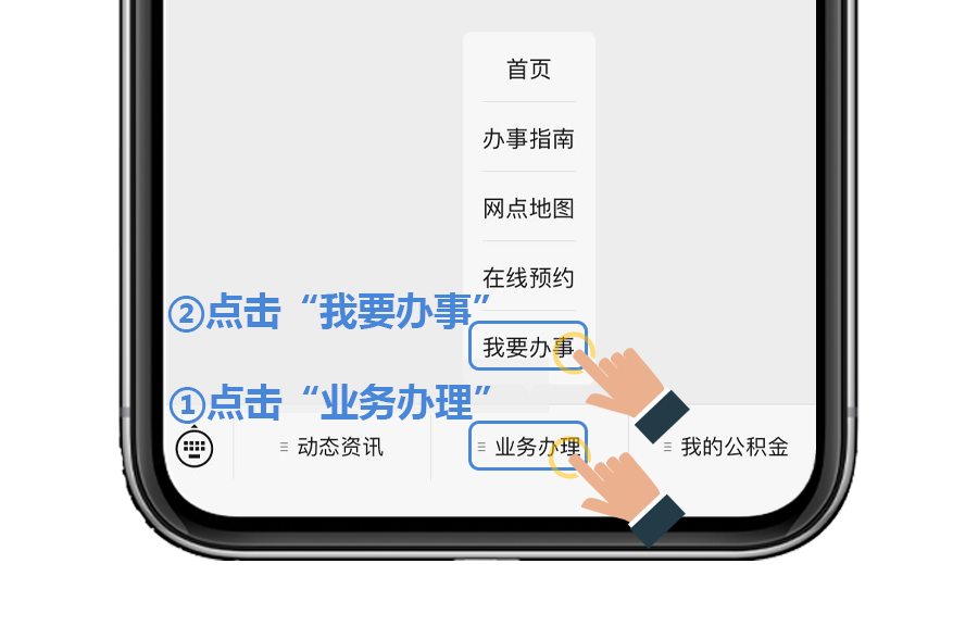 点击“宁夏住房公积金服务”微信公众号菜单栏“业务办理”-“我要办事”按钮,进入微信小程序。操作步骤如下图所示。