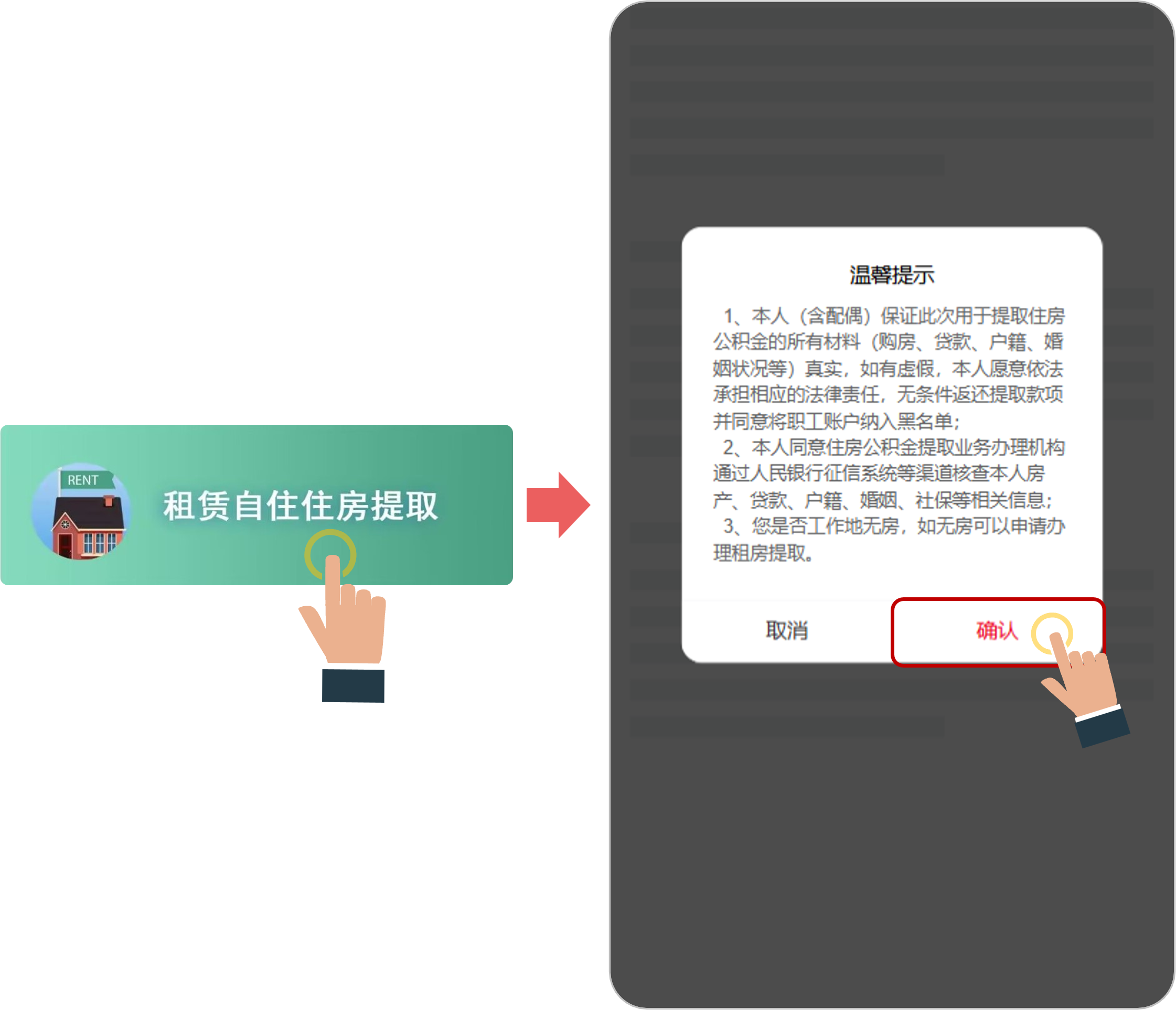 2、第二步注册登录后,在首页点击“我要提取”按钮,找到并点击“租赁自住住房提取”按钮,阅读温馨提示后,点击“确认”按钮。