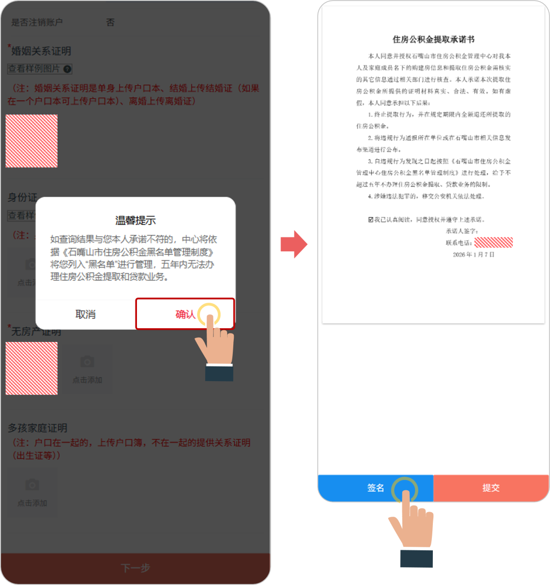 4、第四步查看温馨提示后,点击“确认”按钮,阅读“住房公积金提取承诺书”,点击“签名”按钮,进入签名页面。