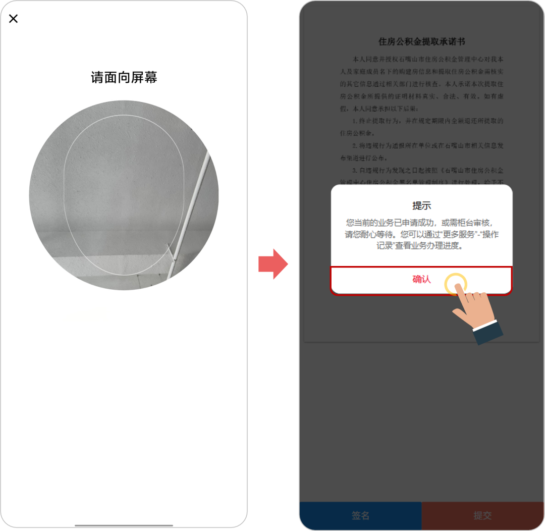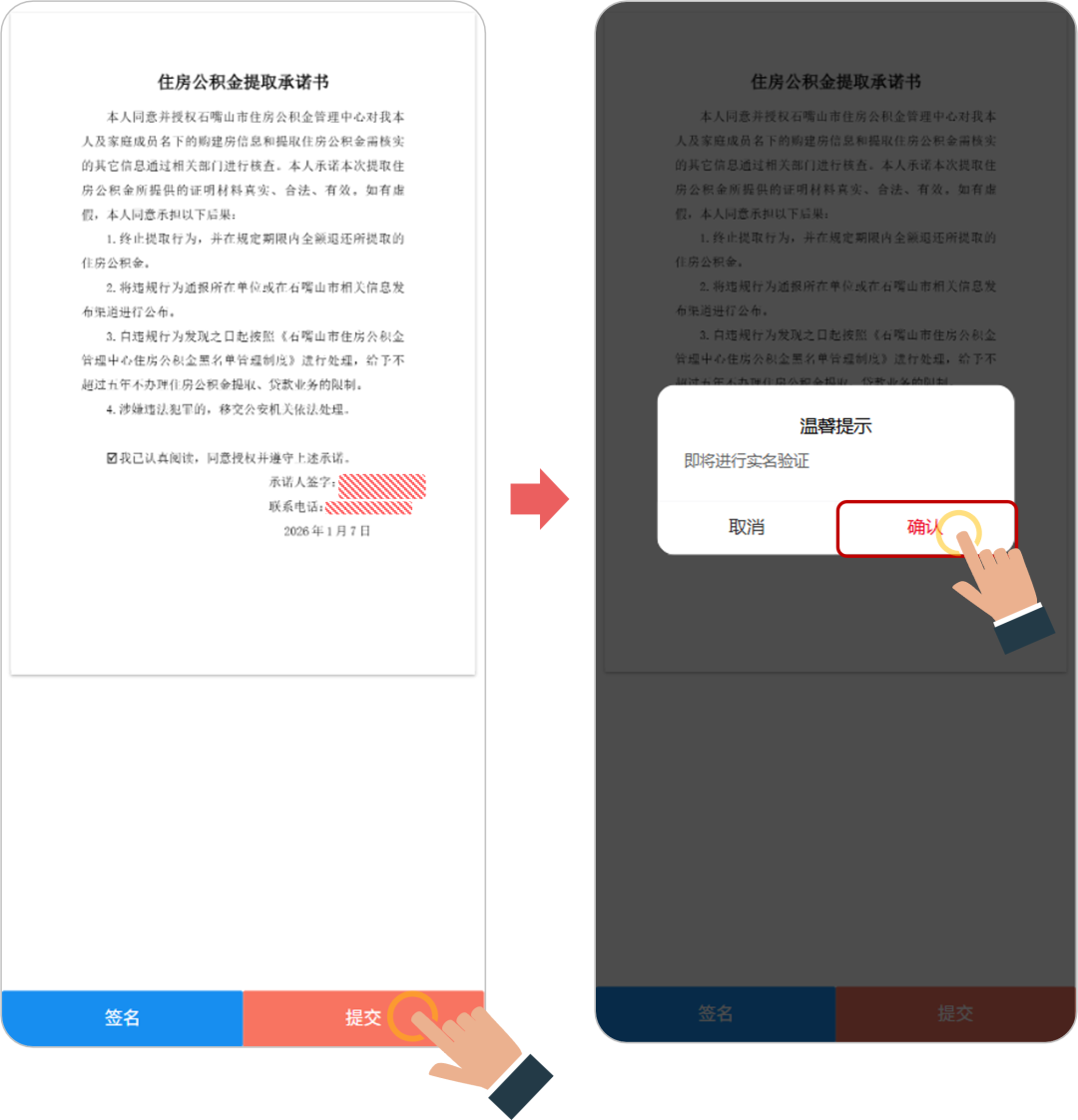 6、第六步查看签名后的“住房公积金提取承诺书”并点击“提交”按钮,之后点击身份验证弹窗上的“确认”按钮,进行实名认证。